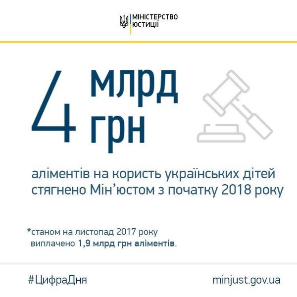 Министерство юстиции Украины с начала 2018 года взыскало 4 миллиарда гривен с неплательщиков алиментов в пользу детей.