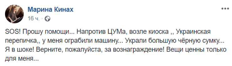 "SOS! Прошу помощи... Напротив ЦУМа, возле киоска "Київська перепічка", у меня ограбили машину... Украли большую черную сумку... Я в шоке! Верните, пожалуйста, за вознаграждение! Вещи ценны только для меня", – написала она.