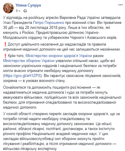 По ее словам, Министерство здравоохранения Украины и Министерство обороны Украины приняли совместный приказ, чтобы все защитники украинских границ и национальной безопасности при необходимости могли своевременно получить необходимую медицинскую помощь в условиях военного положения.