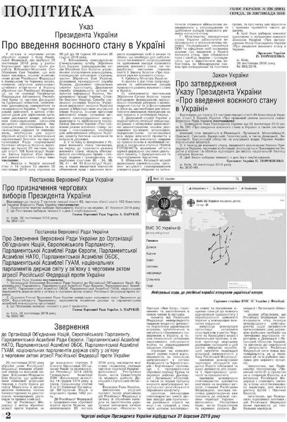 Отметим, в ночь на 26 ноября СНБО рекомендовал ввести президенту Петру Порошенко военное положение на всей территории Украины сроков на 60 суток. Однако в ходе консультаций с народными депутатами президент решил ввести военное положение на 30 суток и не на всей территории Украины.