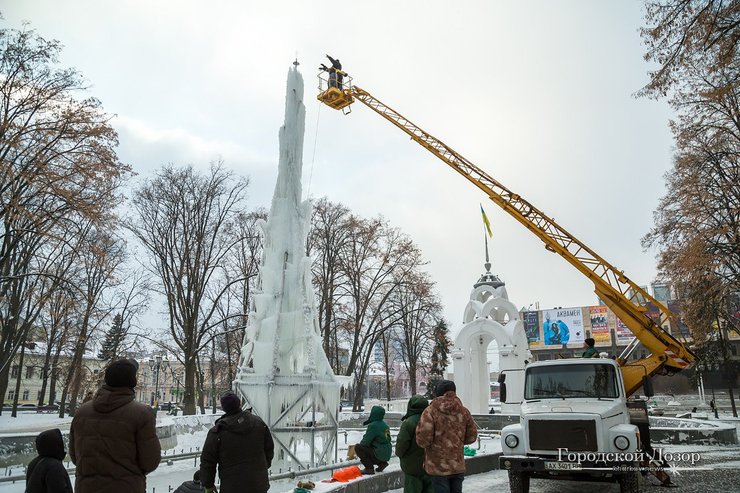 В Харькове возле Зеркальной струи коммунальные службы устанавливают большую ледяную скульптуру "Новогодняя елка".