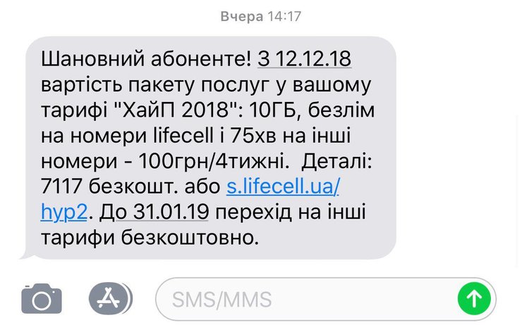 Для примера, согласно полученным абонентами оператора сообщениям, с 12 декабря тарифы "Лайфхак 2018" (150 мин и 20 ГБ за 99 грн) и "Лайфхак Плюс 2018" (300 мин и 30 ГБ за 149 грн) оператор предлагает заменить на "Лайфхак" (150 мин и 20 ГБ 3ф 175 грн), при этом подключение и миграция на тарифные планы "Лайфхак 2018" будет недоступна. До 31 января 2019 года абонент может бесплатно перейти на любой другой тариф, открытый для подключения или же перейти на контрактный план "Лайфхак Контракт" с абонплатой 125 грн/мес. После 25 января стоимость перехода на другой тарифный план будет составлять 50 грн.
