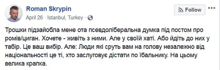 Помимо религиозной темы, общественный резонанс приобретают и конфликты на национальной почве. Так, весной нынешнего года ультранационалистическая организация С14 совершила нападение на лагерь ромов в Голосеевском парке, спровоцировав острую дискуссию в социальных сетях. Среди тех, кто позволил себе неоднозначные высказывания, отметился и журналист Роман Скрыпин.