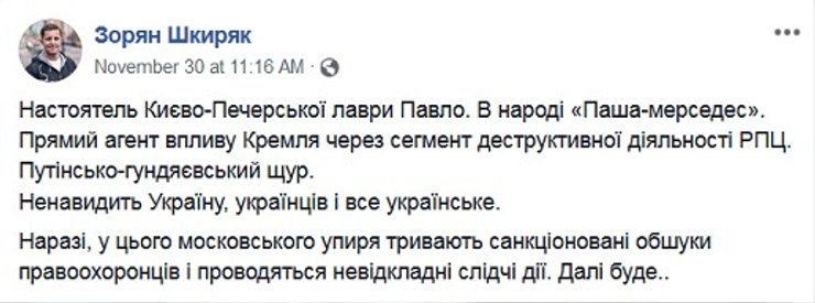 Интерес правоохранителей вызвало интервью наместника Киево-Печерской лавры митрополита Павла (Лебедя), который публично заявил, что предстоятель УПЦ КП Филарет "поцеловался с бесом". Теперь Павлу (Лебедю) грозит штраф, а обыски, переместившиеся в Житомирскую и Овручскую епархии, завершились изъятием печатной продукции, которая якобы содержит признаки разжигания религиозной и межконфессиональной розни. Ее уже отправили на экспертизу.