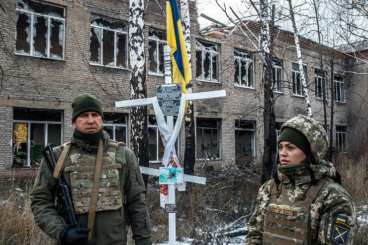 Память. Пески, 18 ноября. В этой могиле похоронены двое украинских солдат. Ее часто навещают бойцы, которые защищают поселок