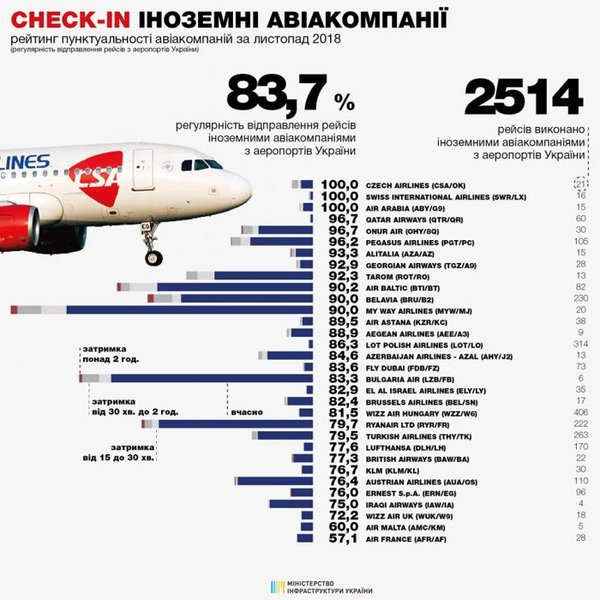 В целом иностранные авиакомпании в ноябре летали в/из украинских аэропортов 2 514 раз, средний показатель пунктуальности составил 83,7%.