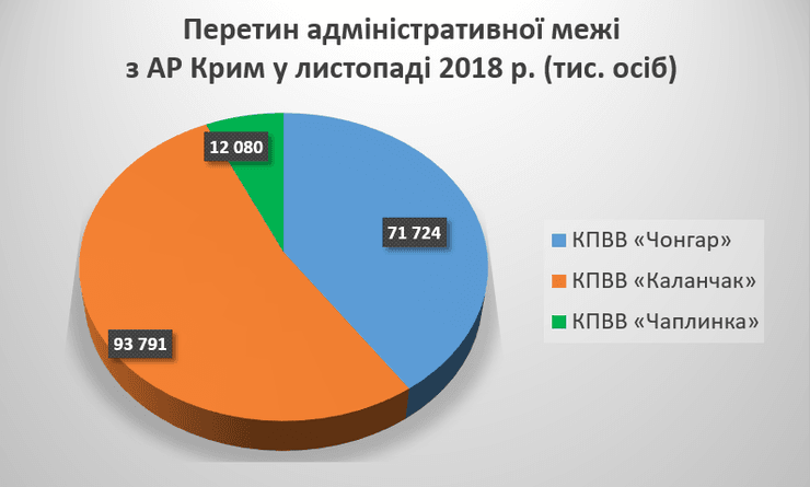 По данным ведомства, больше всего пересечений в обоих направлениях зафиксировано в контрольном пункте въезда-выезда Каланчак, немного меньше в КПВВ Чонгар, а наименьше - в КПВВ Чаплинка.