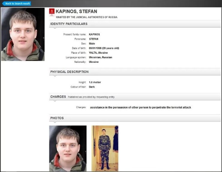 Интерпол по запросу России объявил в розыск 20-летнего гражданина Украины Стефана Капиноса по подозрению в подготовке с украинцем Павлом Грибом "теракта" в школе в Сочи (РФ). Об этом сообщают Українськi Новини.