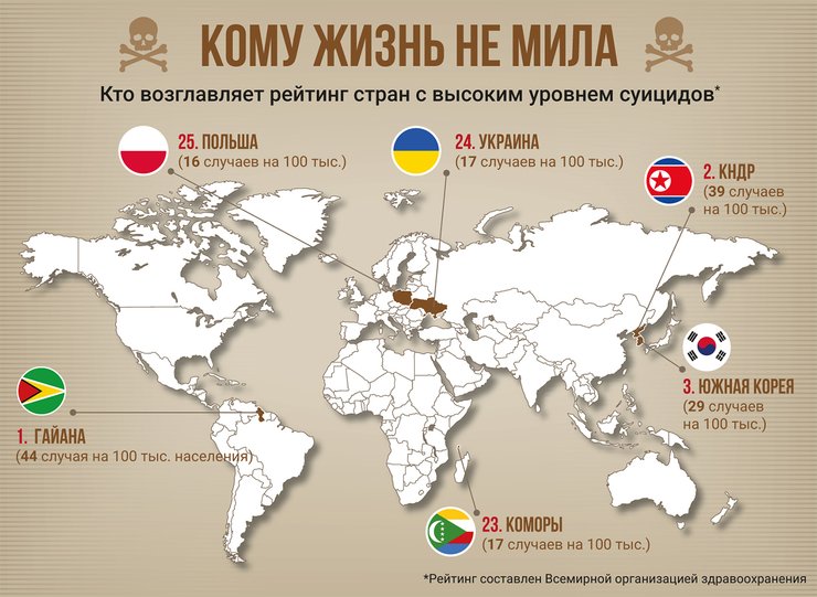 Осенью ВОЗ опубликовала статистику, из которой стало известно, что по количеству самоубийств Украина занимает 24 место в мире. Некоторые интернет-СМИ разразились громкими заголовками о том, что государство оказалось в лидерах печального рейтинга и даже стало "рекордсменом Европы". Реальность несколько отличается от пугающих новостей. На самом деле количество суицидов в Украине заметно снизилось: в этом же рейтинге еще в 2012 году страна занимала 21 место, а в 2009 — вообще 13.