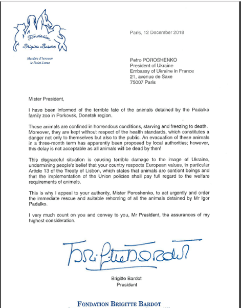 Легендарная французская актриса Бриджит Бардо написала открытое письмо президенту Украины Петру Порошенко, в котором просит использовать свое влияние, чтобы спасти диких животных из частного зоопарка в Покровске Донецкой области.
