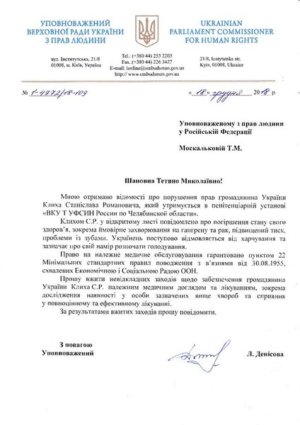 Уполномоченная Верховной рады по правам человека Людмила Денисова направила письмо российскому омбудсмену Татьяне Москальковой с требованием предоставить украинскому политзаключенному Станиславу Клыху медицинскую помощь.
