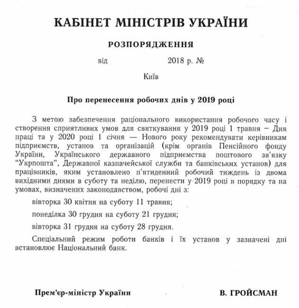 Кабмин утвердил список дополнительных выходных на 2019 год