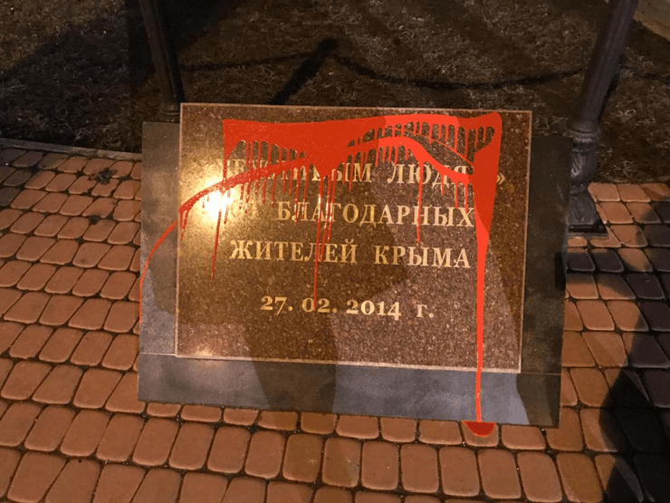 В оккупированном Симферополе памятник "зеленым человечкам" облили краской