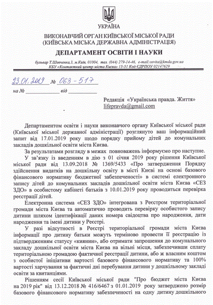 На запрос издания, в КГГА сообщили, что, согласно решению №1369 / 5433 от 13 сентября 2018 года, с 10 января 2019 в системе электронной записи детей в коммунальные учреждения дошкольного образования в личном кабинете родителей проверяют регистрацию детей.