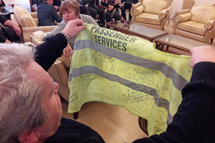 "У каждой семьи свое горе. И если бы не оно, мы не знали бы друг друга, не были бы здесь в посольстве. Я мама киборга – "Адама", Максима Ридзанича. Сын дважды был в аэропорту и дважды вышел живым", – рассказывает Светлана Ридзанич из поселка Коцюбинское, что под Киевом. Она показывает желтый жилет со множеством подписей, привезенный Максимом из аэропорта, хранит его как память. "Некоторых ребят уже нет в живых", – говорит мама бойца 90-го батальона.