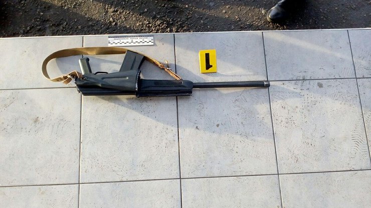 Прямо у входа в здание неизвестный выстрелил в людей из охотничьего карабина "Сайга". Оружие находится на месте преступления.
