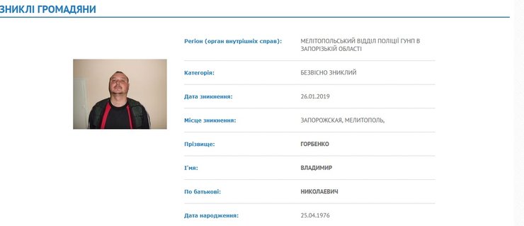 Согласно ей, мужчина пропал с поля зрения правоохранителей 26 января 2019 года. Место исчезновения – Мелитополь Запорожской области.