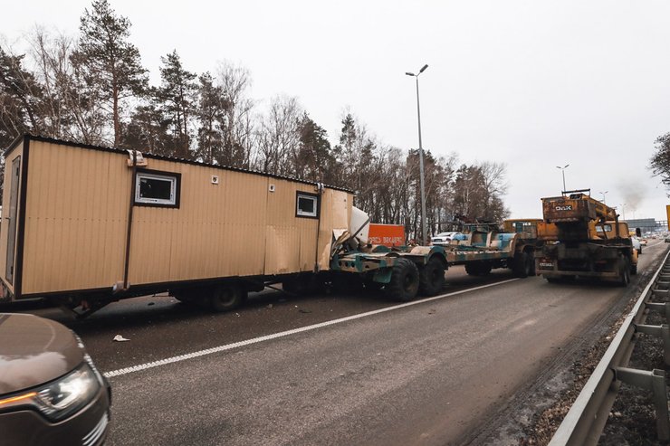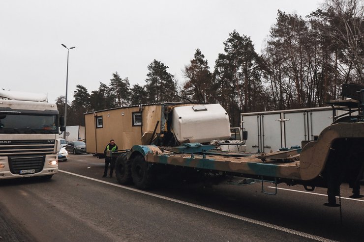 Масштабная авария произошла утром 5 февраля на Житомирской трассе. Грузовик со строительным вагончиком на прицепе врезался в военный тягач. Подобные используются для перевозки тяжелой техники. Травмы получил водитель грузовика. Об этом сообщает Киев Оперативный.