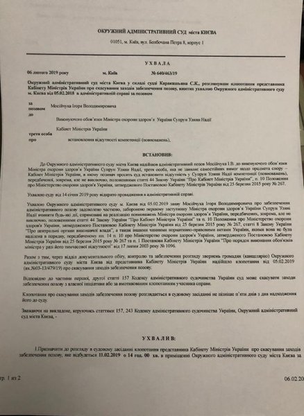 - Окружной административный суд Киева запретил Супрун исполнять обязанности министра здравоохранения. Cуд принял решения в качестве обеспечительной меры по иску нардепа Игоря Мосийчука.