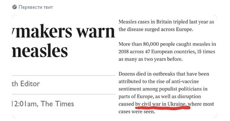 Статья с идеологически некорректной фразой вышла на сайте The Times в пятницу днем, 8 февраля. В материале раскрывается тема распространении кори в Европе, в частности в Украине.