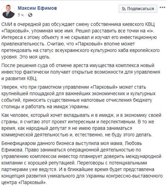 "Интереса к этому объекту я не скрывал и изучал его инвестиционную привлекательность. Считаю, что "Парковый" вполне может претендовать на статус всеукраинского культурного хаба европейского уровня. Это моя цель. После решения суда об отмене ареста имущества комплекса новый инвестор фактически получает открытые возможности для управления и развития КВЦ", - написал он.