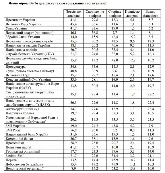 Наименьшим доверием среди граждан Украины пользуются государственный аппарат (чиновники) (не доверяют 83%), СМИ России (83%), Верховная Рада (82%), суды (78%), политические партии(77%), правительство (75% ), коммерческие банки (75%), президент (71%), прокуратура (70%), Нацбанк (68%) и Верховный Суд (65%).