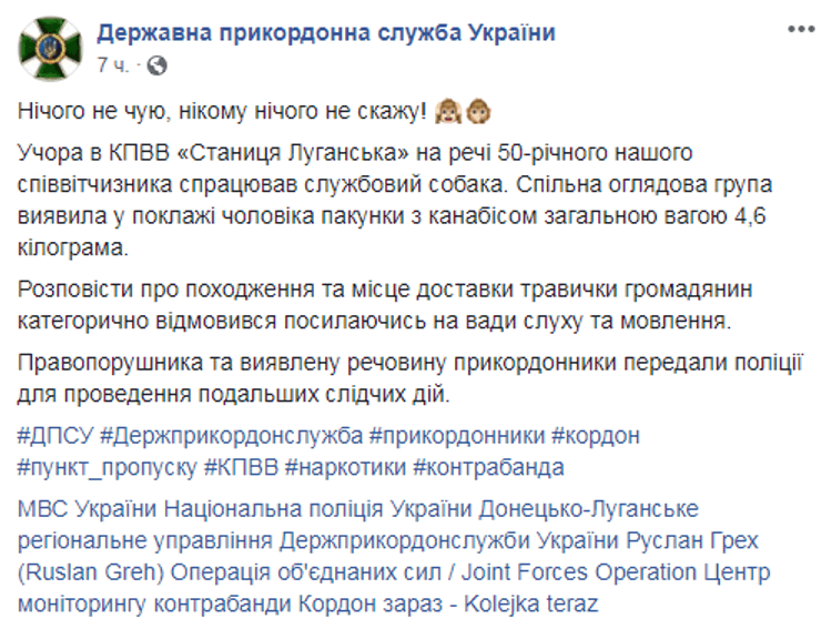 Пограничники обнаружили почти пять килограмм марихуаны в 50-летнего мужчины. Инцидент случился на контрольном пункте Станица Луганская.
