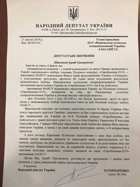 "Вслед за группой Freedom Jazz отказалась от участия в Евровидении и KAZKA. Исходя из этого, я уже без иронии написал депутатское обращение к главе НОКУ Зурабу Аласании с предложением отправить Вячеслава Кириленко на конкурс от Украины. Учитывая талант и умение находиться на волне внимания медиа, Вячеслав достойно заменит не только MARUV, но и принесет нам очередную победу на Евровидении", - написал нардеп.
