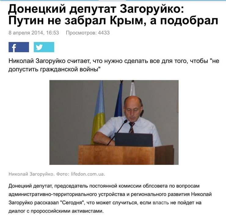 "Из Донецка сообщают, что там вчера уехал "на подвал" Николай Загоруйко. Бывший руководитель фракции Партии регионов в Донецком областном совете", - сообщил Казанский.