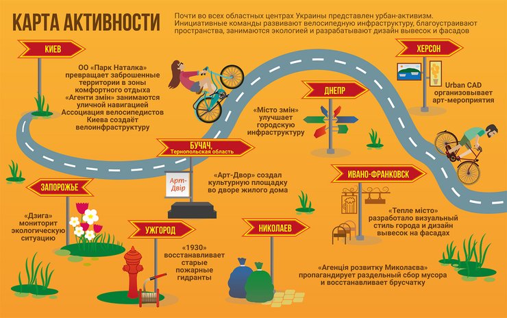 Численность городских жителей в Украине увеличивается, но инфраструктура меняется гораздо медленней. Горожанам не хватает визуально красивых и комфортных пространств, и тогда они инициируют изменения сами: заброшенные помещения заводов преобразуют (ревитализируют) в творческие пространства, развивают велодвижение, благоустраивают парки.