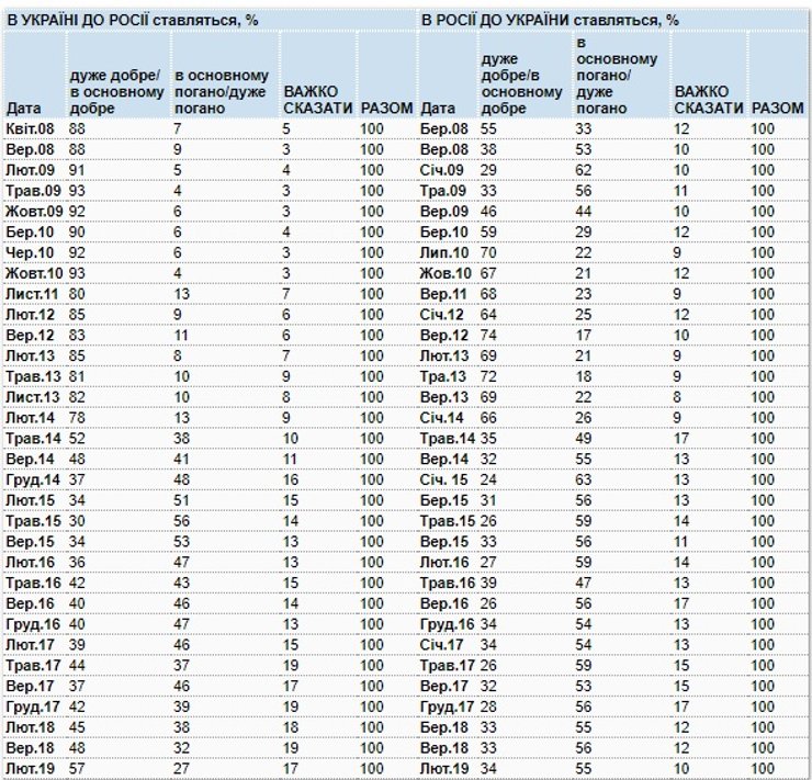 "В Украине в феврале 2019 года хорошо или очень хорошо относилось к России 57% украинцев, плохо или очень плохо – 27%, 17% не определились, к россиянам (гражданам России) положительно относилось 77% украинцев, к руководству России – 13% (преимущественно за счет Востока и Донбасса)", - сказано в сообщении.