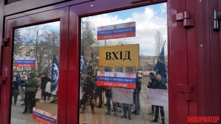 Вход в НАБУ активисты обклеили наклейками "Торговля с оккупантом - бизнес на крови".