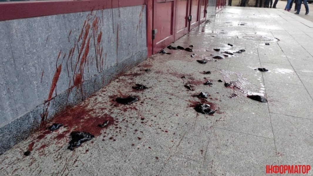 Активисты националистической организации "Традиция и порядок" залить кровью и обклеили стикерами вход в здание НАБУ.