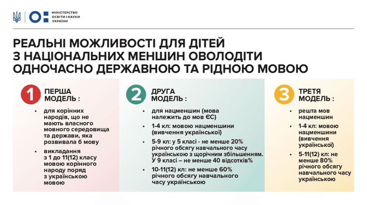 Первая модель дает возможность преподавания на языке меньшинства всех предметов с 1-го по 11 (12)-й класс вместе с украинским языком.