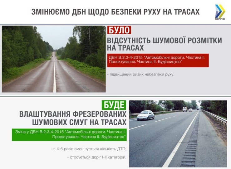 Согласно новым нормам, которые касаются проектирования дорожных покрытий, предлагается предусматривать на дорогах I и II категорий устройство фрезерованных шумовых полос.