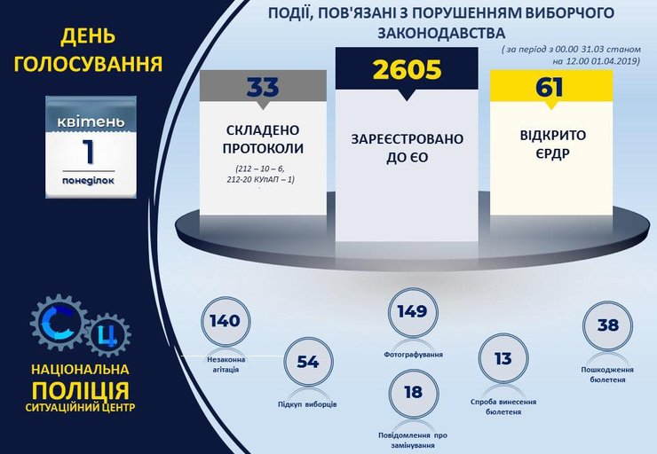 Кроме того, по состоянию на 12.00 1 апреля в полицию поступило 2605 сообщений о событиях и правонарушениях, связанных с нарушением избирательного законодательства, начиная с 31 марта.
