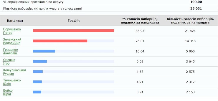 Действующий президент Петр Порошенко набирает 38,93%. Лидер студии "Квартал 95" Владимир Зеленский набирает 26,01% голосов, лидер Гражданской позиции Анатолий Гриценко – 10,64%, экс-глава СБУ Игорь Смешко – 6,62%, представитель националистов Руслан Кошулинский – 4,67%, лидер "Батикивщины" Юлия Тимошенко – 4,21%, представитель "Оппозиционной платформы – За жизнь" Юрий Бойко – 3,91%.