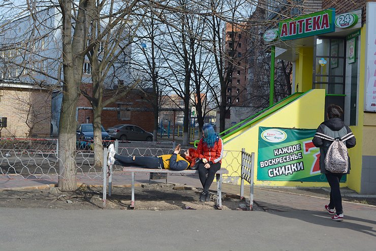С активисткой мы встречаемся перед Славянским горсоветом, рядом с пустующим постаментом, где до июня 2015 года стоял памятник Ленину. Просторная площадь залита солнечным светом, несмотря на рабочий день, здесь людно: кажется, что первое весеннее тепло всех заставило выйти на улицу. Сложно поверить, что пять лет назад город словно вымер. Не выехавшие из Славянска люди в центр выходили лишь по крайней необходимости, любая вылазка могла стать последней. При этом даже тогда здесь продолжали функционировать заводы: рабочих не отпускали в отпуск, а пропускавших смены увольняли.