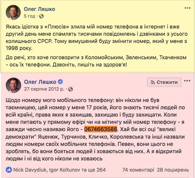 Журналистка Мария Жартовская в комментариях под постом отметила, что в 2012 году Ляшко сам обнародовал свой номер телефона в Facebook.