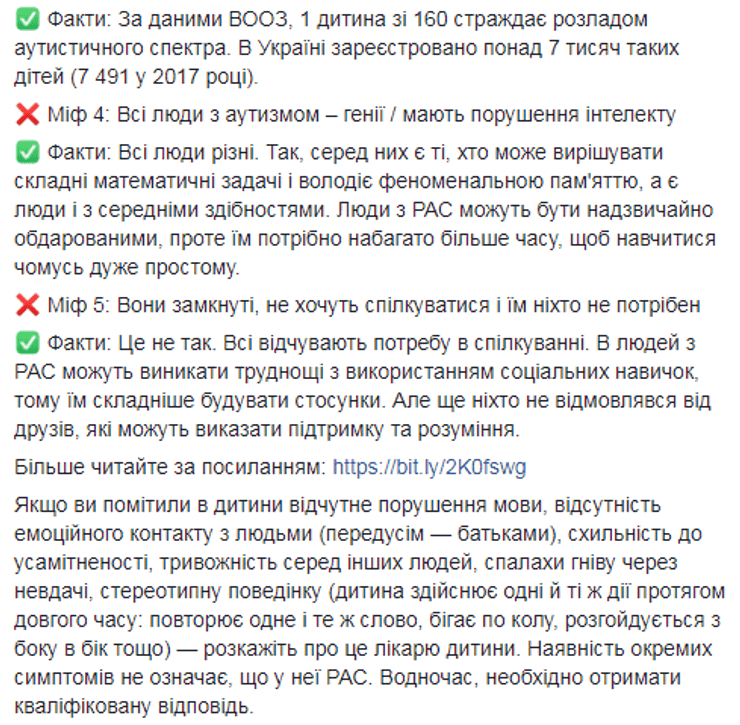 Также Супрун предложила больше узнать об аутизме, чтобы не быть жертвами стереотипов, что это болезнь, которая связана с вакцинацией, а все лица с аутизмом - замкнутые гении.