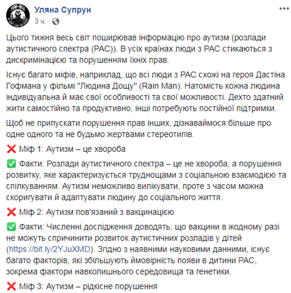 "На этой неделе весь мир распространял информацию об аутизме (расстройства аутистического спектра). Во всех странах люди с РАС сталкиваются с дискриминацией и нарушением их прав. Существует много мифов, например, что все люди с РАС похожи на героя Дастина Гофмана в фильме "Человек дождя" (Rain Man). Вместе с тем каждый человек индивидуален и имеет свои особенности и свои возможности. Некоторые способны жить самостоятельно и продуктивно, другие нуждаются в постоянной поддержке", - отметила она.