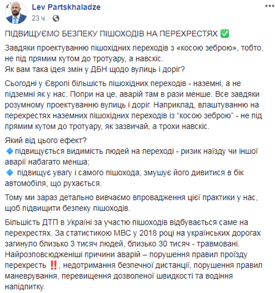 "Большинство ДТП в Украине с участием пешеходов происходит именно на перекрестках. По статистике МВД в 2018 году на украинских дорогах погибло около 3 тысяч человек, около 30 тысяч - травмированы. Самые распространенные причины аварий - нарушение правил проезда перекрестков, несоблюдение безопасной дистанции, нарушение правил маневрирования, превышение разрешенной скорости и вождение навеселе", - отметил Парцхаладзе.
