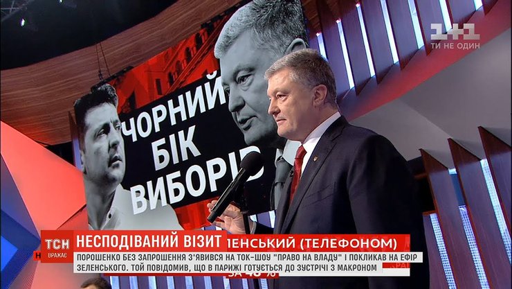 Поздним вечером в четверг Порошенко и Зеленский впервые столкнулись в публичном разговоре. Президент находился в студии телеканала "1+1", а Зеленский разговаривал с ним по телефону. Находясь по пути в Париж, где оба кандидата в пятницу будут встречаться с Эммануэлем Макроном. Беседа между кандидатами вышла довольно резкая и короткая.