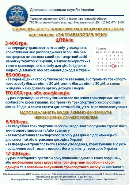 Так, в сообщении говорится, что штрафные санкции ужесточатся с 24 мая 2019 года. Также подчеркивается, что до 23 мая в стране еще действуют либерализованные нормы об административной ответственности для владельцев автомобилей на еврономерах. Далее гражданам грозит штраф, при превышении срока транзита или временного ввоза авто, в размере 170 тыс. гривен или же конфискация транспортного средства.