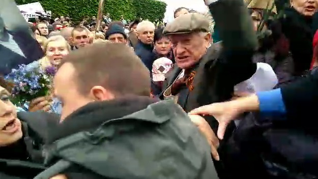 В Киеве перед Вечным огнем в Парке славы произошла потасовка между участниками шествия "Бессмертного полка" и националистом, который пытался обратить внимание полиции на георгиевскую ленту на пальто одного из участников акции. Об этом сообщает корреспондент Фокуса с места событий.
