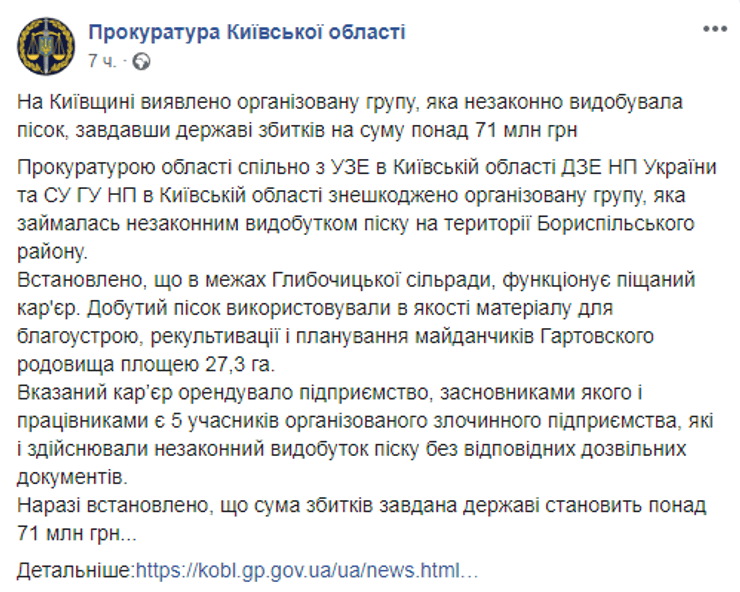 Карьер арендовало предприятие, учредителями и работниками которого являются пятеро участников ОПГ, которые добывали песка без соответствующих разрешительных документов. Сумма ущерба, нанесенного государству, составляет более 71 млн грн.