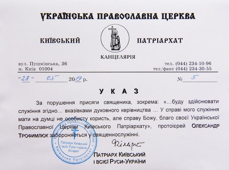 Свое решение Филарет обосновал якобы нарушением Трофимлюком присяги священника, в частности непослушанием духовному руководству.