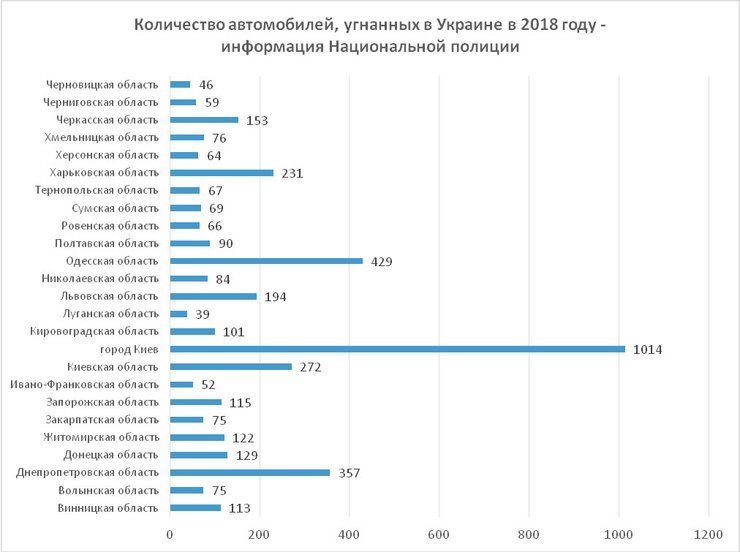 За 2018 год в Украине угнали 4092 автомобиля. При этом, 25% всех угонов приходятся на Киев, 10% на Одесскую область и примерно 9% на Днепропетровскую область.