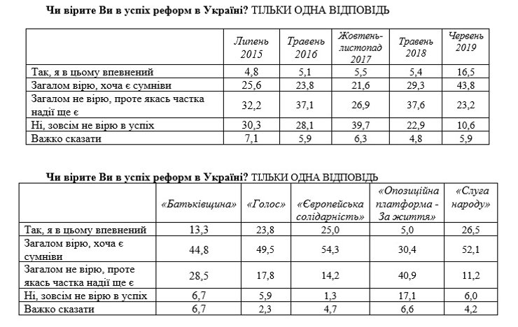 Верят в успех реформ избиратели почти всех политических сил, имеющих шанс пройти в Верховную Раду. Исключение составляют только избиратели "Оппозиционной платформы – За жизнь", среди которых большинство (58%) в успех реформ не верят.