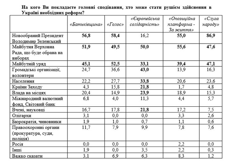 Наибольшие надежды в осуществление реформ граждане возлагают на президента Владимира Зеленского (61,5%), Верховную Раду нового созыва (46%) и на будущее правительство (42%).